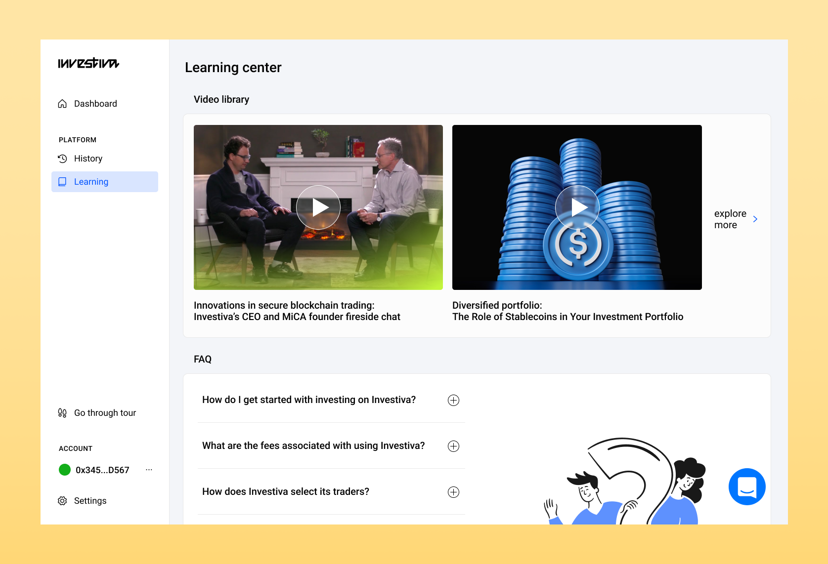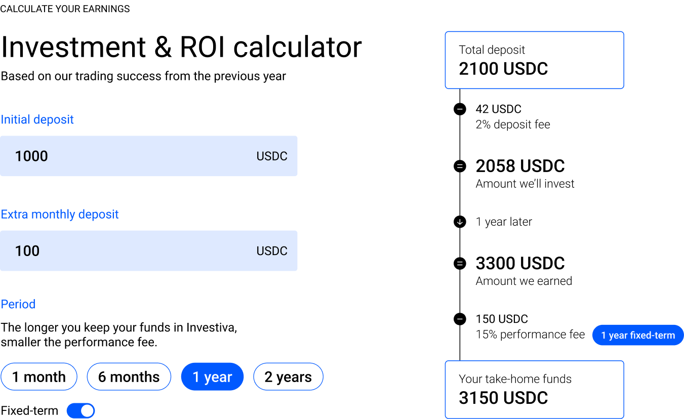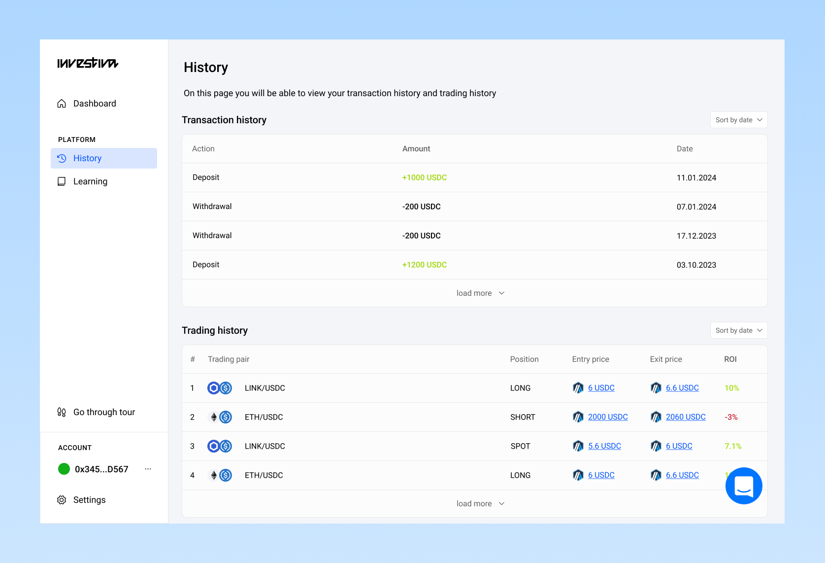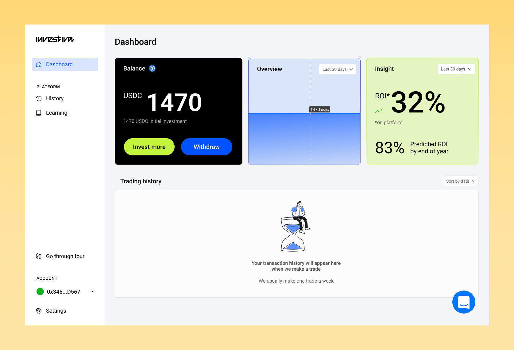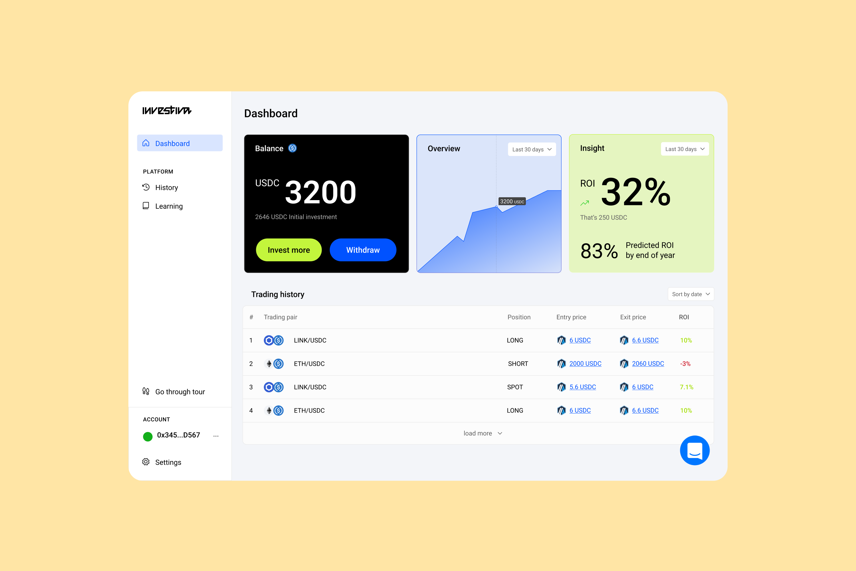 Investiva is an application that allows users to deposit USDC, a stable cryptocurrency, to a so-called smart contract. The smart contract represents an additional level of security. It allows only the user to withdraw their funds, which means that even if the platform fails and the trader is corrupt, the funds remain owned by the user. Traders working for Investiva choose how to invest funds from users and give instructions to the smart contract. After a successful or unsuccessful investment, the user has a little more or less money in the account. Taking into account the previous success of the trader, the user can expect a return on investment (ROI) of 80% on an annual basis.