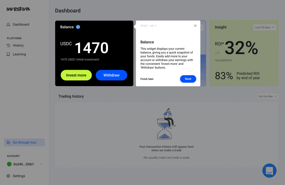 An interactive onboarding process to guide new users through the platform’s features and investment options.