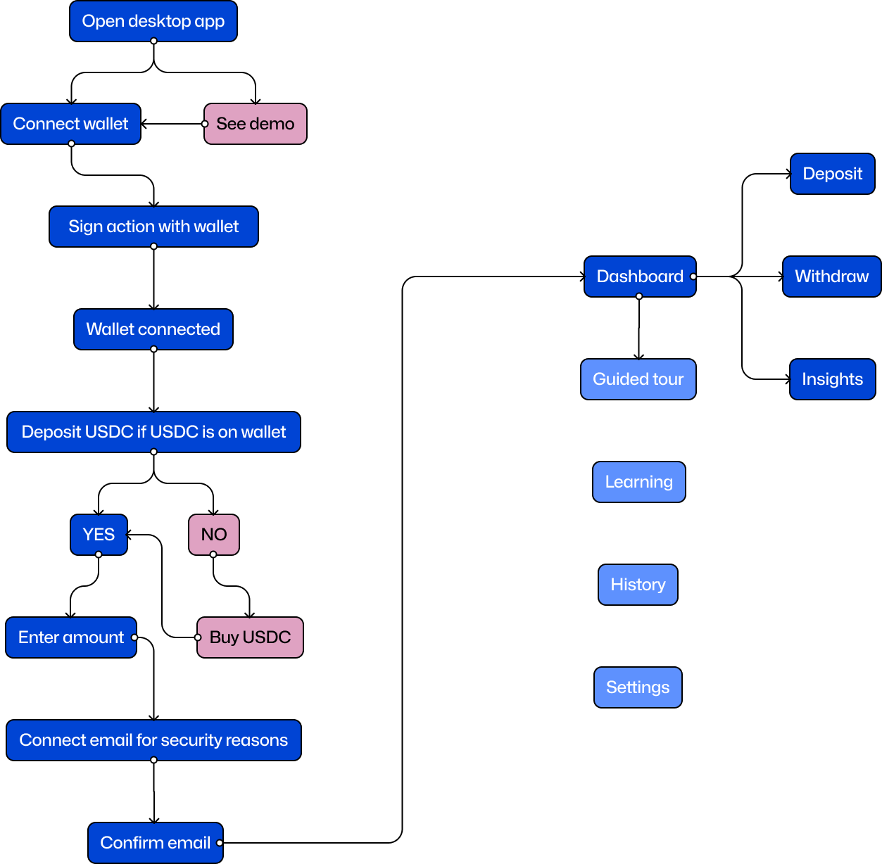 I love it when I don’t open Figma as soon as I start working on a project. I created a user flow diagram that maps every action we would anticipate users needing in the MVP, and after that I got to designing a visual direction, landing page and application at the same time.
