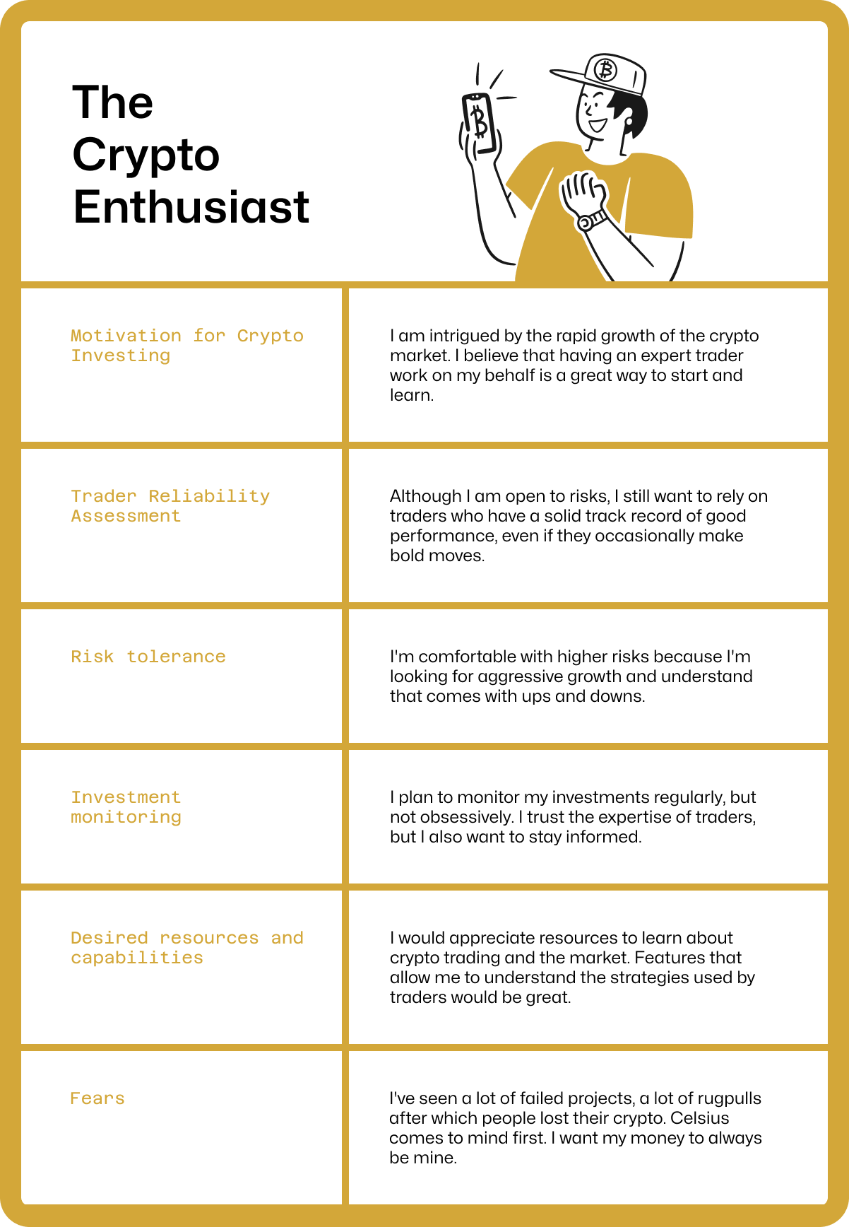 We conducted 10 interviews and, based on their answers, managed to divide users into two logical groups: the Cautious Investor and the Crypto Enthusiast.